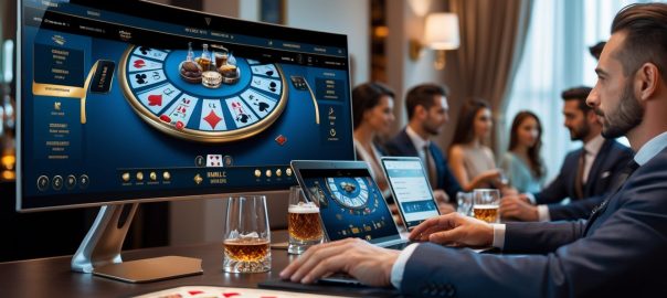Suasana modern dengan beberapa orang bermain baccarat online menggunakan komputer dan ponsel di ruangan yang elegan.