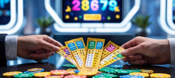 Tangan memegang tiket lotere berwarna-warni dan chip di atas meja dengan layar digital menampilkan angka jackpot di latar belakang.