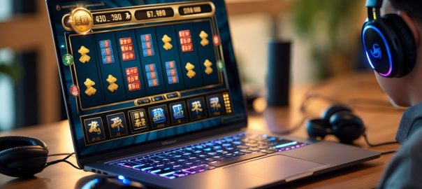 Sebuah laptop menampilkan permainan slot dan mahjong online dengan aksesori gaming di sekitarnya dalam ruangan yang nyaman.
